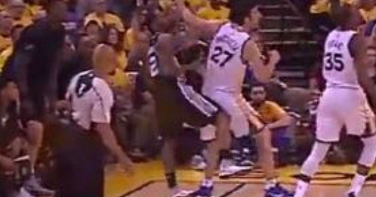 Zaza Pachulia with his foot under Kawhi Leonard while shooting.