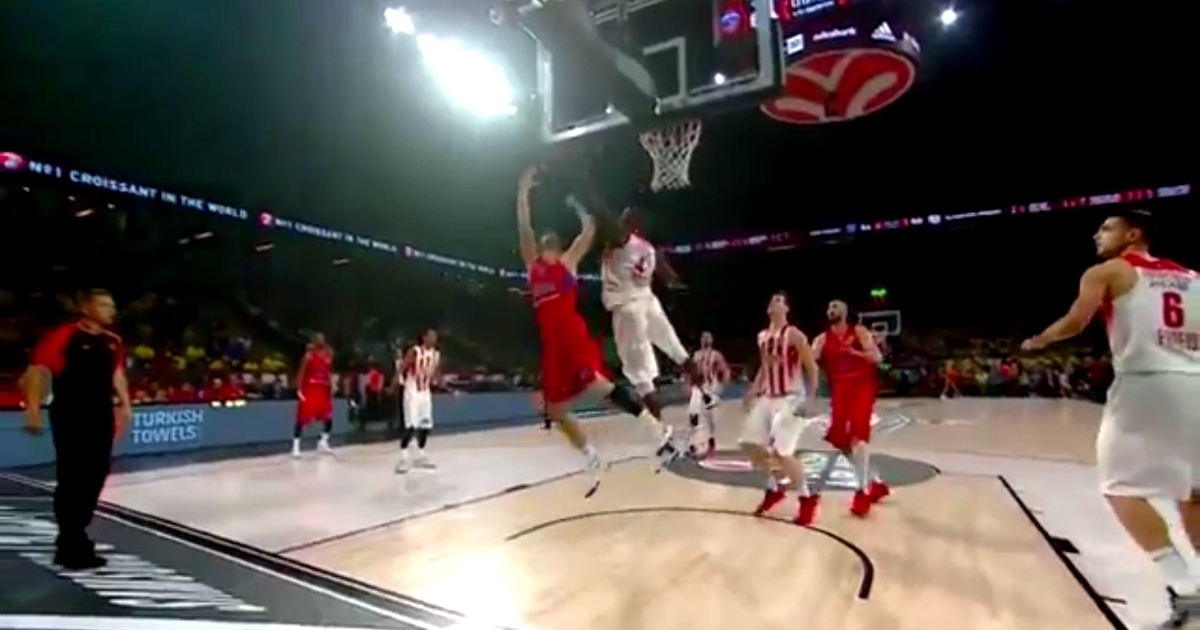 Ο Μίλος Τεόντοσιτς πέρασε την άμυνα του Ολυμπιακού, έφτασε κοντά στο καλάθι, αλλά υπολόγιζε χωρίς τον... Πάτρικ Γιανγκ!