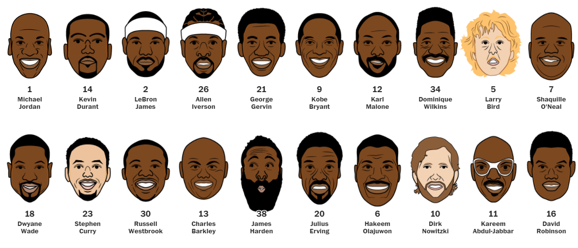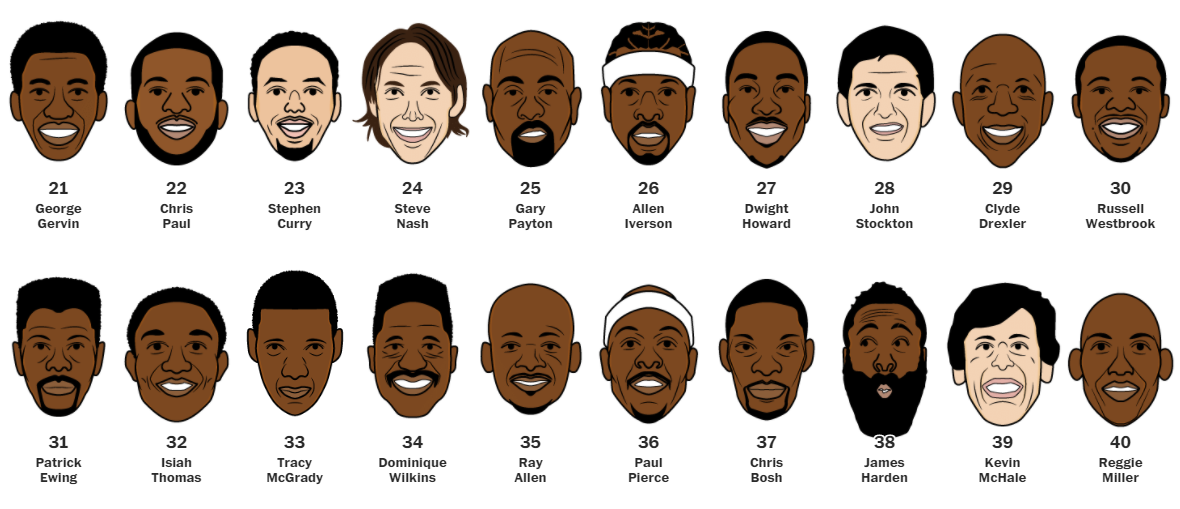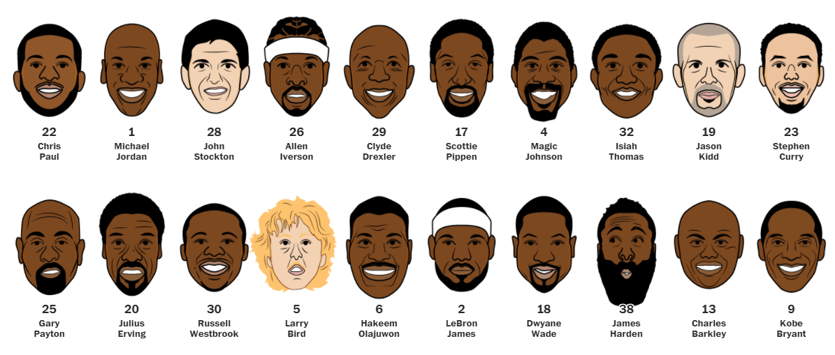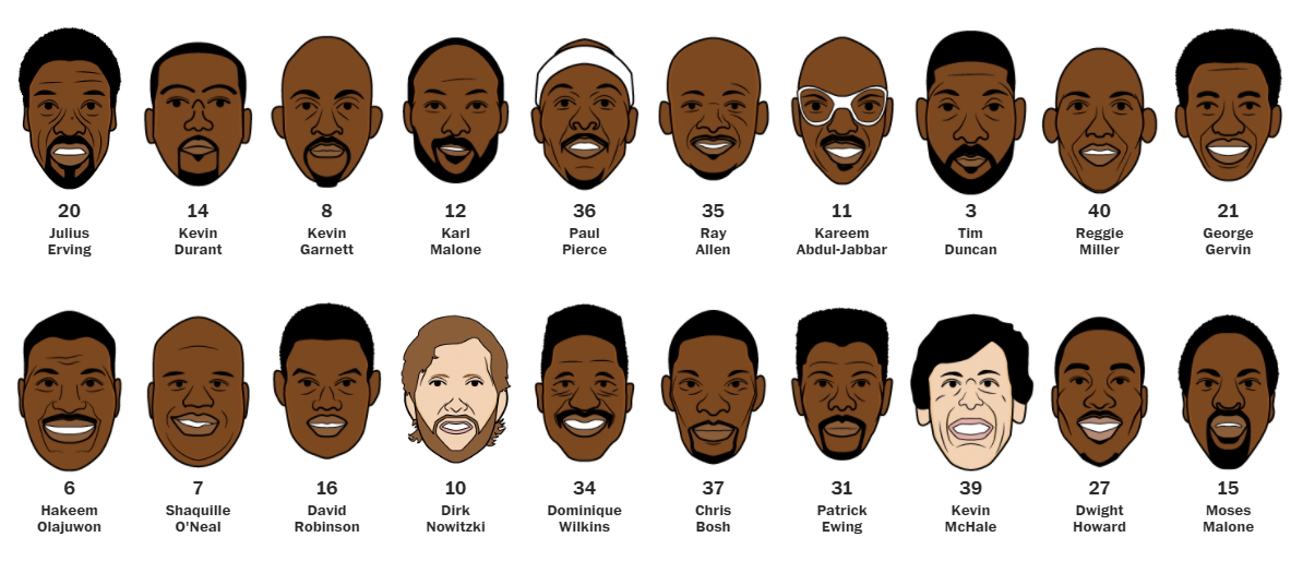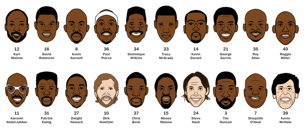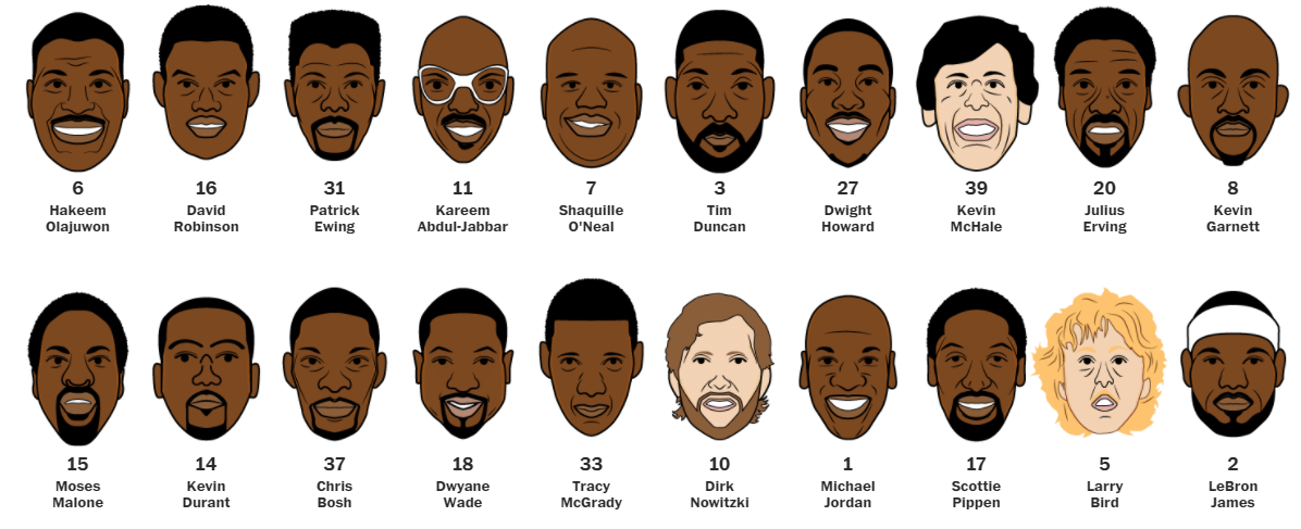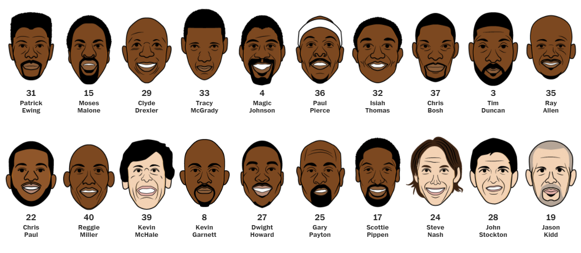 Την δεκάδα συμπληρώνουν οι Μάτζικ Τζόνσον, Λάρι Μπερντ, Χακίμ Ολάζουον, Σακίλ Ο'Νίλ, Κέβιν Γκαρνέτ, Κόμπι Μπράιαντ και Ντιρκ Νοβίτσκι.