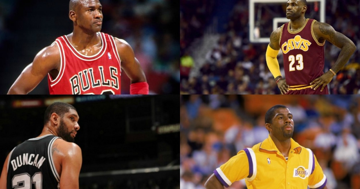Προφανώς εδώ πέρα το ΝΟ 1 ανήκει στον Μάικλ Τζόρνταν. Έχει 6 στα 6 πρωταθλήματα στους τελικούς και αποτελεί το ίνδαλμα εκατοντάδων ανθρώπων. Ηγέτης στα δύσκολα. Δεν επηρεάστηκε απο το γεγονός πως έκανε ένα break στην καριέρα του με τους Μπουλς για να πάει στο baseball για χάρη του πατέρα του. Γύρισε στο μπάσκετ και πήρε 3 σερί πρωταθλήματα. Δίχως αμφιβολία είναι ο GOAT. Ανίκητος επιθετικά και εξαιρετικός στα αμυντικά του καθήκοντα. Τα buzzer beater του έχουν μείνει στην ιστορία.