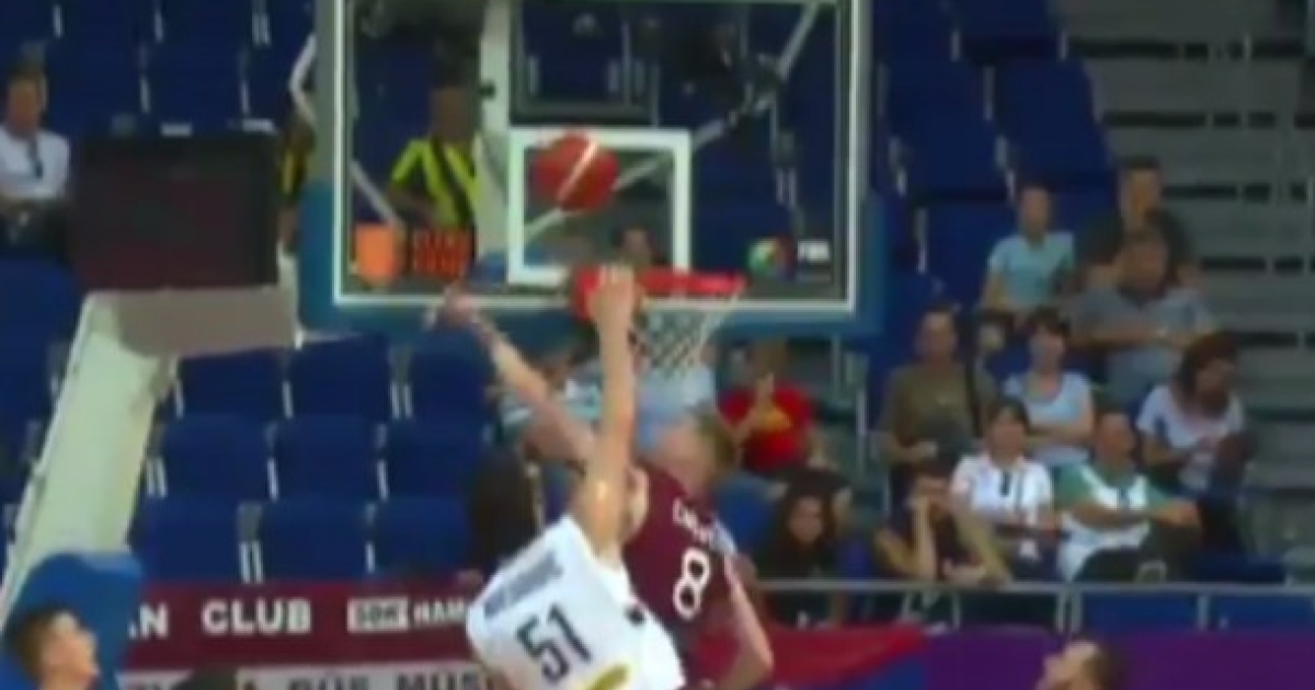 Ο γίγαντας της Σερβίας πήγε να καρφώσει με δύναμη, αλλά ο φόργουορντ των Σαν Αντόνιο Σπερς και της Λετονίας του το απαγόρευσε.