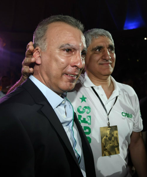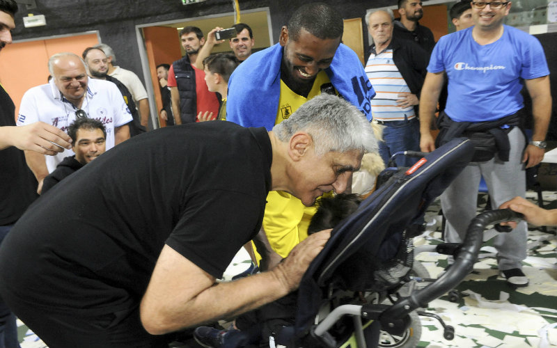 Στο τέλος του αγώνα, σε μια συγκινητική στιγμή, αγκάλιασε μικρό φίλαθλο του Άρη ο οποίος αντιμετωπίζει κινητικά προβλήματα και πάντα κάθεται δίπλα στον πάγκο της ομάδας. Στη συνέχεια έκανε αυτό που συνηθίζει να πράττει. Έδειξε τους παίκτες του γιατί (στην πραγματικότητα) αυτοί είναι οι πρωταγωνιστές. Στο κλίμα ενθουσιασμού που επικράτησε, η δική του αποθέωση ήταν στον κατάλογο των… προβλεπόμενων. Έδωσε συγχαρητήρια στους παίκτες του και λίγο μετά πήγε στην αίθουσα Τύπου. Εκεί τον περίμενε όλη η οικογένεια. Τα δύο εγγόνια του, ο μικρός Φίλιππος ο οποίος χάθηκε στην αγκαλιά του λίγο μετά την ολοκλήρωση των δηλώσεών του. Άπαντες κάθισαν στην πρώτη σειρά των επισήμων στο Παλέ. Ήξεραν το μέγεθος της σημασίας που είχε το χθεσινό παιχνίδι για τον «Δράκο». Περίπου μία ώρα μετά, έφυγαν όλοι μαζί για τον οικογενειακό δείπνο.