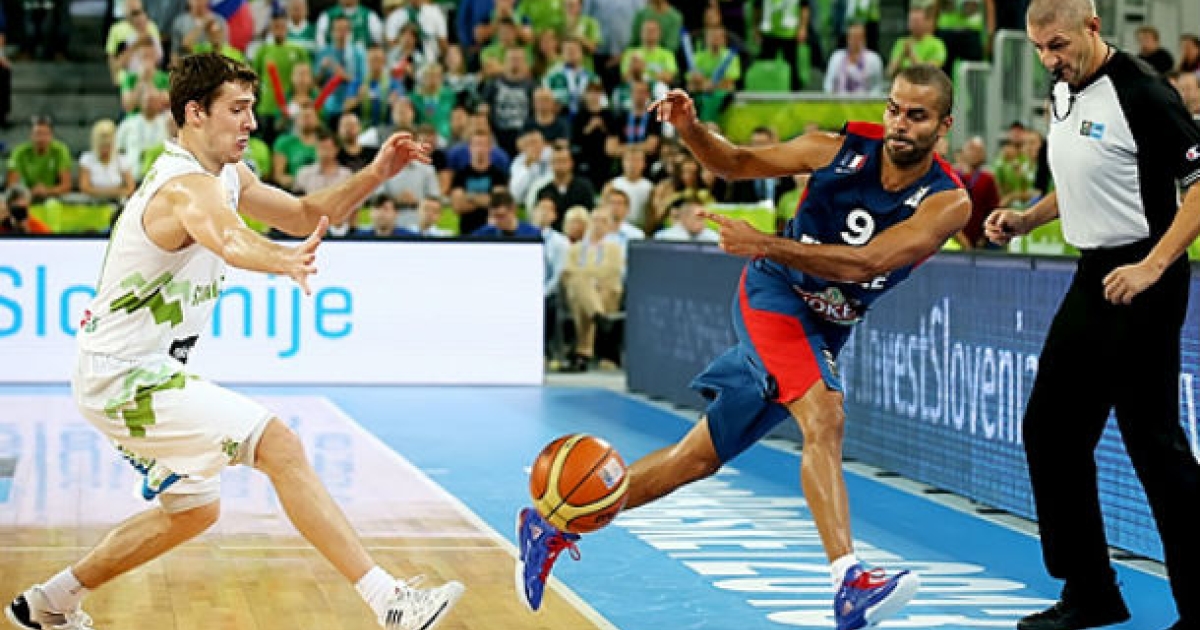 Σλοβενία και Γαλλία συμβάδιζαν στο σκορ στο πρώτο ημίχρονο, με τις ομάδες να παρουσιάζονται ιδιαίτερα άστοχες. Οι γηπεδούχοι στα πρώτα δύο δεκάλεπτα είχαν μόλις 1 εύστοχο τρίποντο σε 14 προσπάθειες, την ίδια ώρα που η Γαλλία είχε 9/28 δίποντα. Ο Ζόραν Ντράγκιτς και ο Τόνι Πάρκερ σημείωσαν από 9 και 10 πόντους αντίστοιχα στο πρώτο μισό της αναμέτρησης (24-26) βγάζοντας συγχρόνως τα.... κάστανα από την φωτιά.