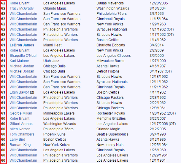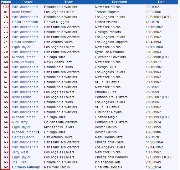 Το ρεκόρ το κατέχει -και δύσκολα θα το σπάσει κάποιος- ο Γουίλτ Τσέιμπερλεϊν που είχε φορτώσει με 100 πόντους το καλάθι των Νικς, ενώ κανείς δεν μπορεί να ξεχάσει την παράσταση του Κόμπι Μπράιαντ (81π.) κόντρα στους Τορόντο Ράπτορς το 2006.