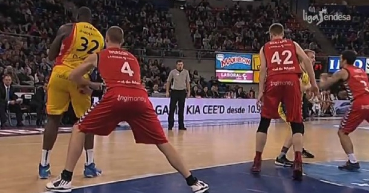 Ο Νέιτ Τζάγουαϊ της Ανδόρα προσπάθησε να ξεγλιστρήσει σαν... χέλι απ' την άμυνα του Κόλτον Άιβερσον της Λαμποράλ Κούτσα στη Fernando Buesa Arena και δεν τα πήγε καθόλου άσχημα.