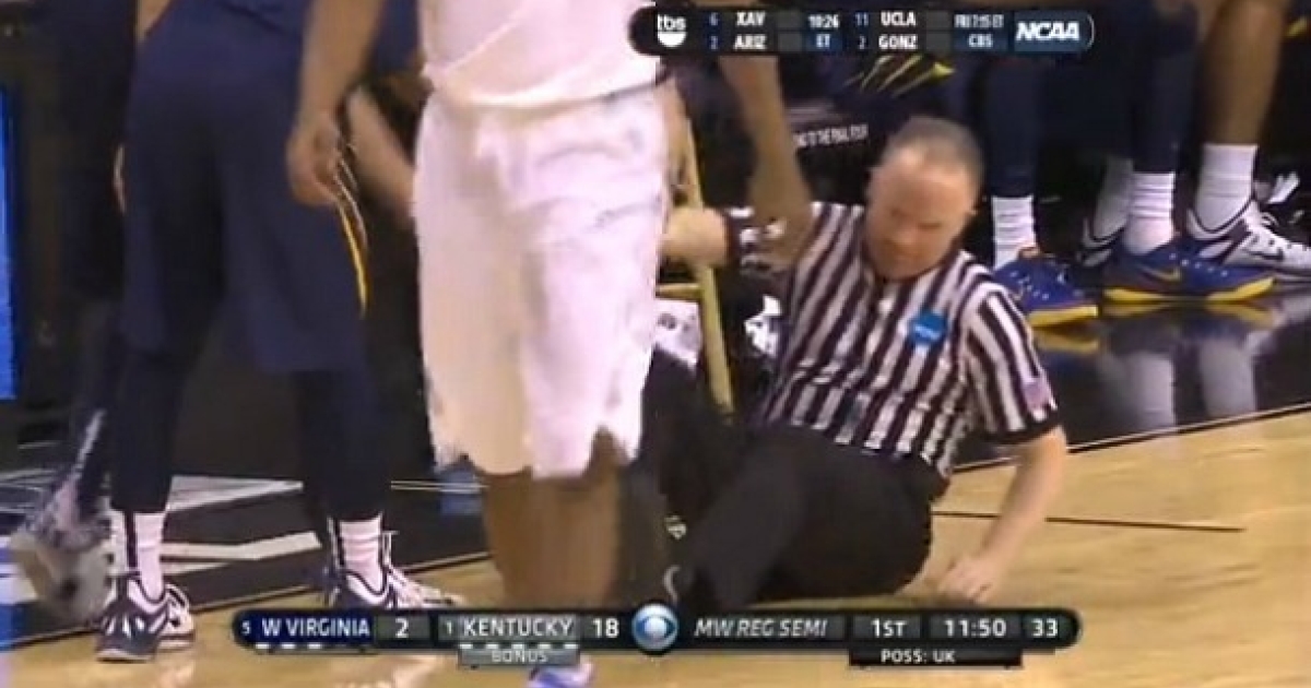 Ο διαιτητής Τζον Γκάφνεϊ... κάλπαζε στο παρκέ, αλλά υπολόγιζε χωρίς τ' απλωμένα πόδια του Γκάρι Μπράουν του WVU, ο οποίος περίμενε γι' αλλαγή.