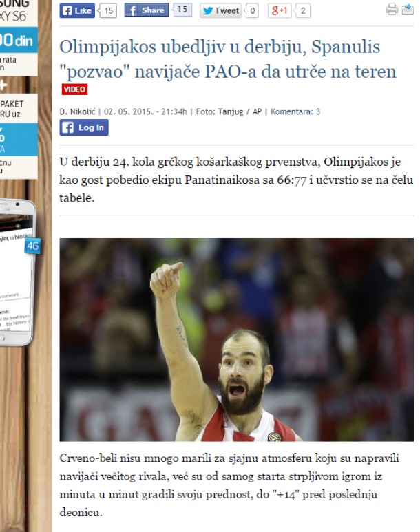Η σέρβικη blic.rs γράφει για τη διακοπή και τον Βασίλη Σπανούλη που προκάλεσε τους φίλους του Παναθηναϊκού, ενώ το mondo.rs καταγράφει τα γεγονότα από τη διακοπή... μέχρι και την αστυνομική δύναμη στο σπίτι του αρχηγού του Ολυμπιακού.