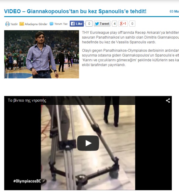Το τουρκικό basketdergisi.com επίσης αναφέρει τι διαδραματίστηκε το βράδυ του Σαββάτου (2/5), ενώ έχει ξεχωριστή αναφορά στο βίντεο που δημοσίευσε ο Ολυμπιακός που υποστηρίζει πως ακούγεται ο Δημήτρης Γιαννακόπουλος να βρίζει τον Βασίλη Σπανούλη.