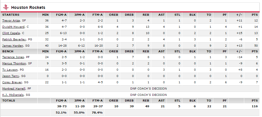 Την 6η τους νίκη πανηγύρισαν οι Χιούστον Ρόκετς (6-10), που επικράτησαν των Σίξερς (0-17) με τον Τζέιμς Χάρντεν να τελειώνει το ματς με 50 πόντους, 9 ριμπάουντ και 8 ασίστ.
