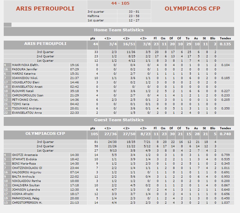 Άρης Πετρούπολης - Ολυμπιακός 44-105