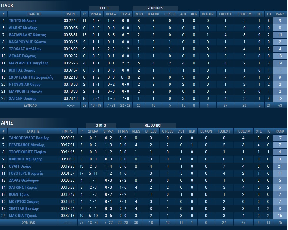 Άρης (Πρίφτης): Ξανθόπουλος, Πελεκάνος 3 (1), Τσούπκοβιτς 3 (1), Γουάιτ 13, Γουότερς 17 (1), Ζάρας 4, Χάγκινς 8, Κόεν 4, Μούρτος 4, Σίμτσακ 2, ΜακΝιλ 19 (3)