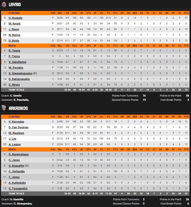 ΝΙΚΗΣΕ ΓΙΑΤΙ: Με εξαίρεση το πρώτο δεκάλεπτο το Λαύριο ήταν ανώτερο στην υπόλοιπη αναμέτρηση και κυριαρχώντας και στις δύο πλευρές πήρε άνετη νίκη. Οι γηπεδούχοι... έχτισαν μικρή διαφορά στη δεύτερη περίοδο κι είχαν τα ηνία μέχρι το τέλος. Ο Αρκαδικός σ' ένα από τα πιο κρίσιμα παιχνίδια της σεζόν πραγματοποίησε κακή δεύτερη και τρίτη περίοδο και δεν μπόρεσε να παρουσιαστεί ανταγωνιστικός.