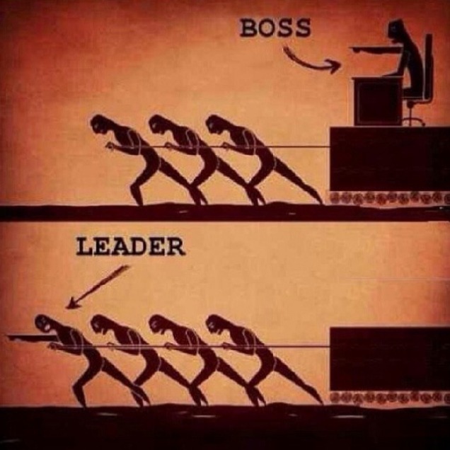 Στην άλλη φωτογραφία εικονίζονται τέσσερις άνθρωποι να σπρώχνουν το ίδιο κουτί και μάλιστα ο πρώτος στη σειρά βάζει την πιο πολλή δύναμη στα σχοινιά. Αυτός είναι ο ηγέτης.