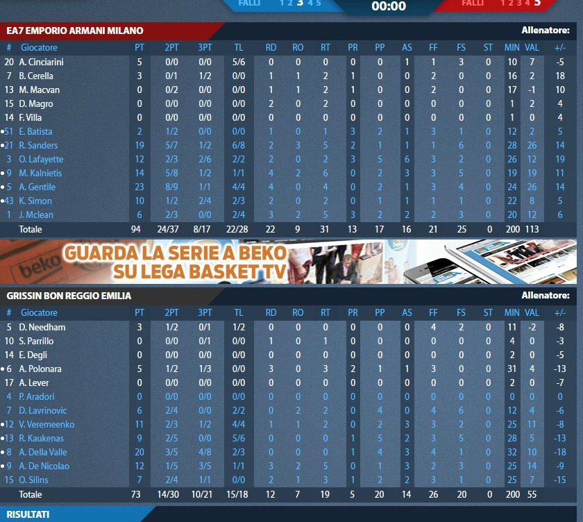 H Aρμάνι Τζινς Μιλάνο άνοιξε τη διαφορά από το δεύτερο δεκάλεπτο, ενώ στο τέλος έτρεξε εξαιρετική τέταρτη περίοδο (25-11) και έκανε το 2/2 στη σειρά των τελικών, πριν πάει στην έδρα της Ρέτζιο Εμίλια (7/6).