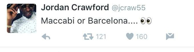 Ένα tweet του Τζόρνταν Κρόφορντ προκάλεσε χαμό σε Ισραήλ και Βαρκελώνη! Ο 27χρονος σούτιγνκ γκαρντ έγραψε στο λογαριασμό του «Μακάμπι ή Μπαρτσελόνα» και τα σχόλια... έπεσαν βροχή.