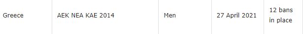 Όπως φαίνεται και από την επίσημη ιστοσελίδα της Παγκόσμιας Ομοσπονδίας Μπάσκετμπολ, η ΑΕΚ έχει πλέον 12 ban, όπερ και σημαίνει ότι έχει σβήσει ήδη δύο...