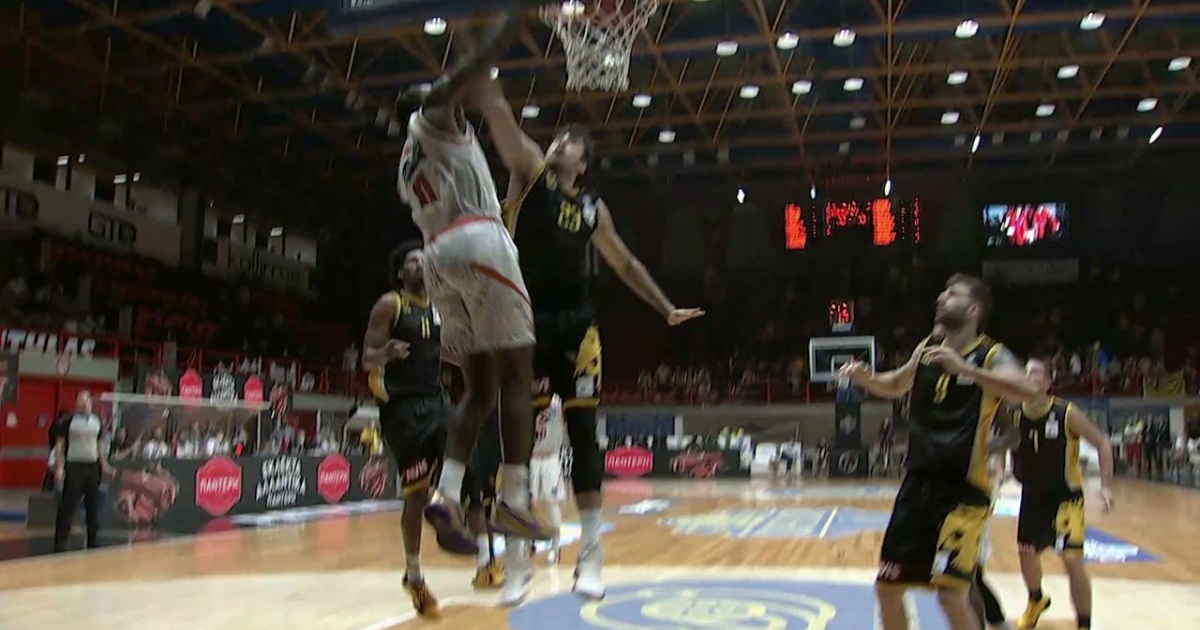 Ο Αμερικανός, άλλοτε γκαρντ της ΑΕΚ πάτησε γερά και κάρφωσε μπροστά στον Αργεντίνο φόργουορντ, ο οποίος έκανε το... λάθος να μπει μπροστά του.