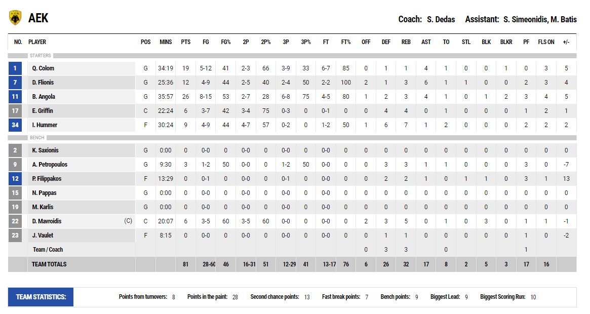 Ενώ ο Κολόμ, στην 3η περίοδο, σίγησε, ο Ανγκόλα δεν σταμάτησε. Με μακρινά σουτ, πάνω σε άμυνα, έδινε σκορ στην ΑΕΚ. Ο Κολομβιανός, μετά από τρία δεκάλεπτα, είχε 23 πόντους και 5/7 τρίποντα!