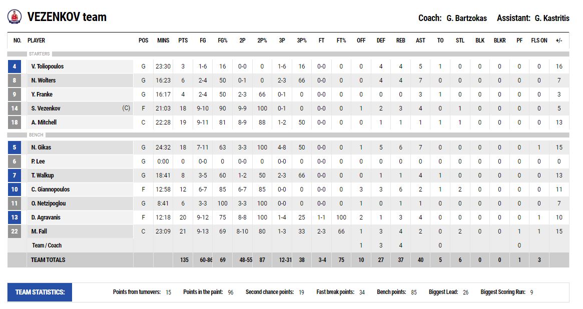 Σε ένα καλάθι της ομάδας του Βεζένκοβ υπήρχε και... παρέμβαση ενός διαιτητή, αφού η μπάλα που πήγαινε άουτ, έγινε τελικά ασίστ από τον ρέφερι για ένα δίποντο. Ενώ και ο Βασίλης Σπανούλης δοκίμασε την τύχη του, από πάσα του Παπανικολάου.