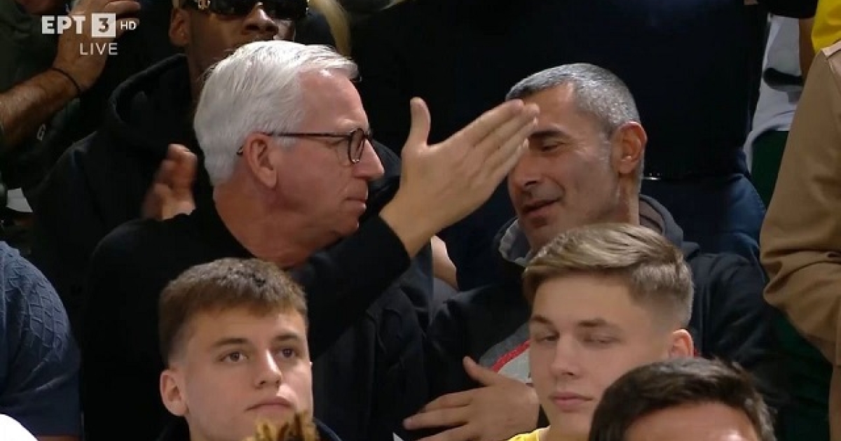 Η κάμερα «έπιασε» τον Άλαν Πάρντιου ενώ συζητούσε με τον άνθρωπο που είχε πάει μαζί στο γήπεδο λίγο μετά το εντυπωσιακό, αλλά και καθιερωμένο σ' αυτά τα ματς, σόου που έκαναν οι φίλαθλοι του Άρη με τα χαρτάκια πριν την έναρξη του αγώνα.