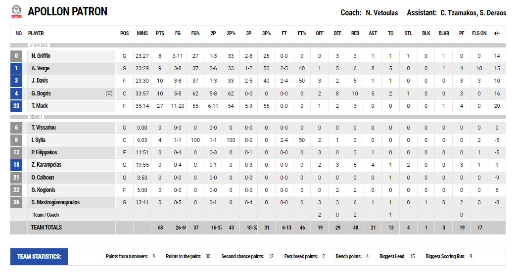 Ο Τέβιν Μακ ήταν «όλα τα λεφτά» για λογαριασμό των νικητών (27π., 6/11δίπ., 5/9τρ.), ο Μπόγρης είχε ένα «γεμάτο» ματς (10π., 10ριμπ., 5ασ.) και κάπως έτσι ο Απόλλωνας έφτασε τις 5 νίκες στο πρωτάθλημα αποκτώντας προβάδισμα όσον αφορά την παρουσία του στα σαλόνια του ελληνικού μπάσκετ και τη νέα σεζόν.
