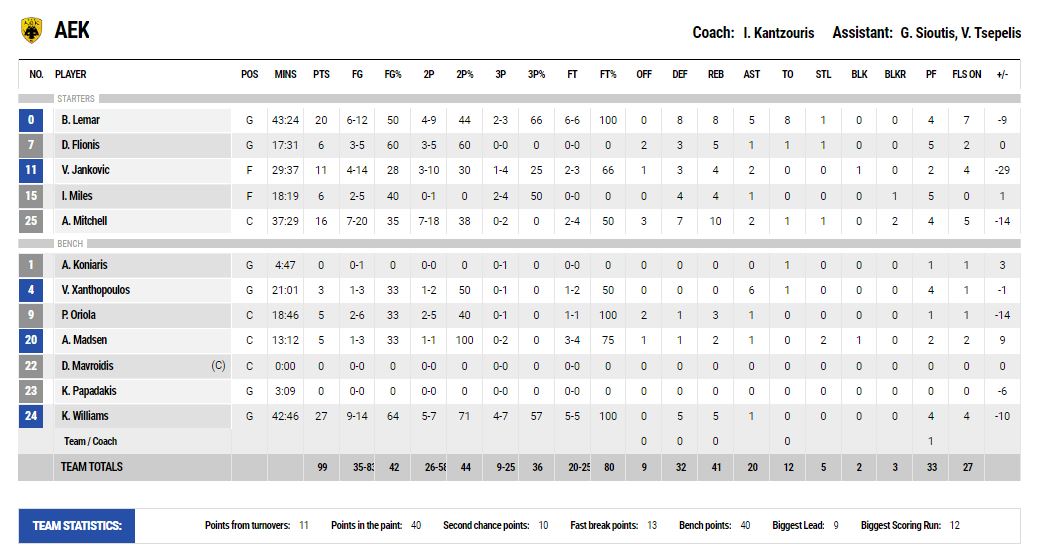 Η ΑΕΚ υποχρεώθηκε να περάσει στον πάγκο τον Αϊζάια Μάιλς (τρία γρήγορα φάουλ), ο Γιάνκοβιτς αποχώρησε με πρόβλημα στο χέρι και ο Καντζούρης διάλεξε ένα σχήμα με τους Μάντσεν και Μίτσελ και τον Φινλανδό μαζί με τον Οριόλα.