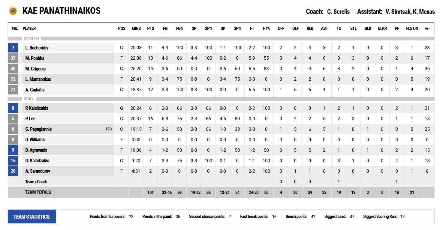 Αυτό ήταν. Το ματς είχε λήξει με... συνοπτικές διαδικασίες καθώς στη συνέχεια η διαφορά ολοένα και έπαιρνε τεράστιες διαστάσεις φτάνοντας και στο +45 (97-52) λίγο πριν από το τέλος του αγώνα.Για να ολοκληρωθεί το ματς με τον Παναθηναϊκό να «φτάνει» σε «κατοστάρα» (101-57).