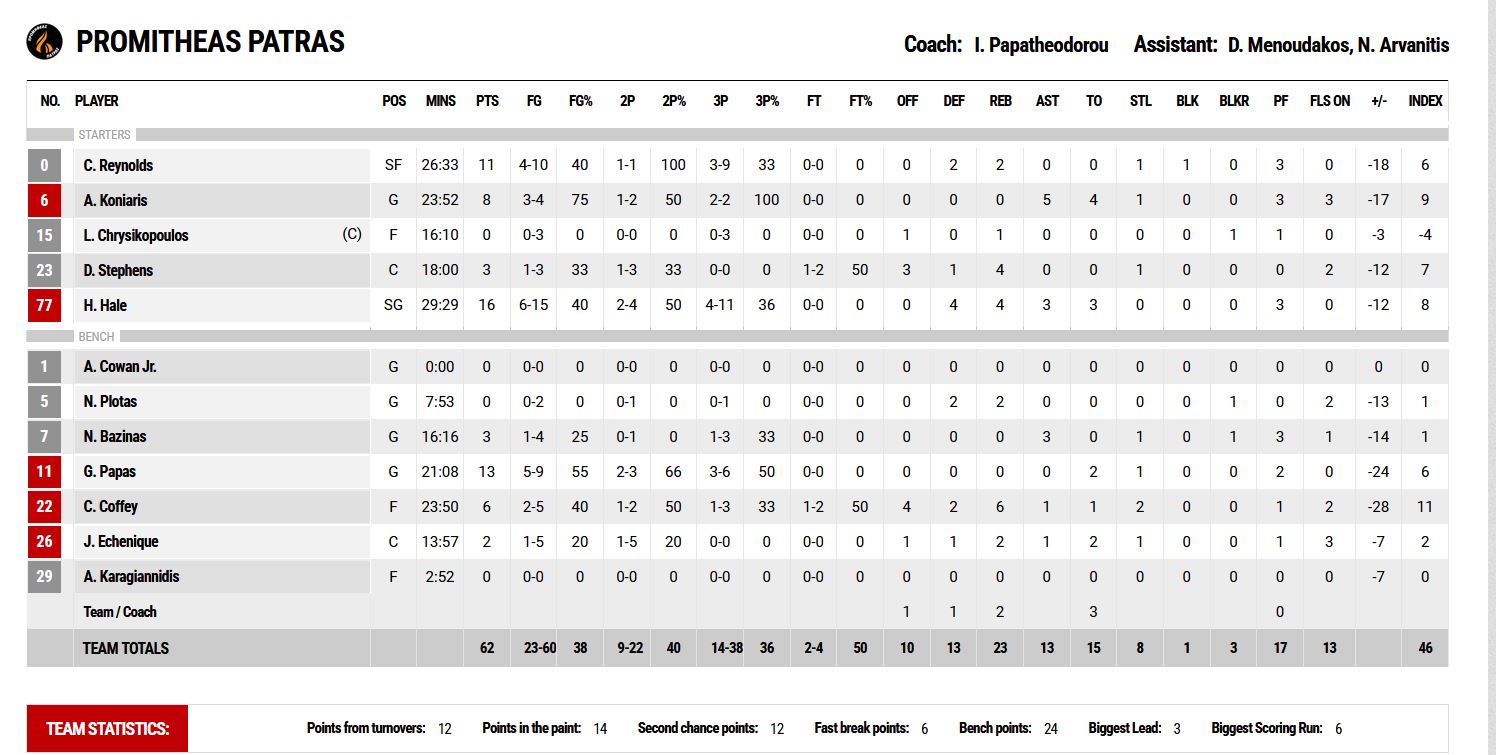 Είναι χαρακτηριστικό ότι στο πρώτο μισό ο Παναθηναϊκός είχε 11/14 δίποντα και 9/15 τρίποντα έχοντας πραγματοποιήσει 30-12 επιμέρους στο 2ο δεκάλεπτο της αναμέτρησης. Συνολικά μέτρησε 17 ασίστ για 5 λάθη, ενώ την ίδια στιγμή ο Προμηθέας Πάτρας είχε μόλις 34% στα σουτ εντός παιδιάς με 5/13 δίποντα και 5/16 τρίποντα, ενώ είχε και 8 λάθη.