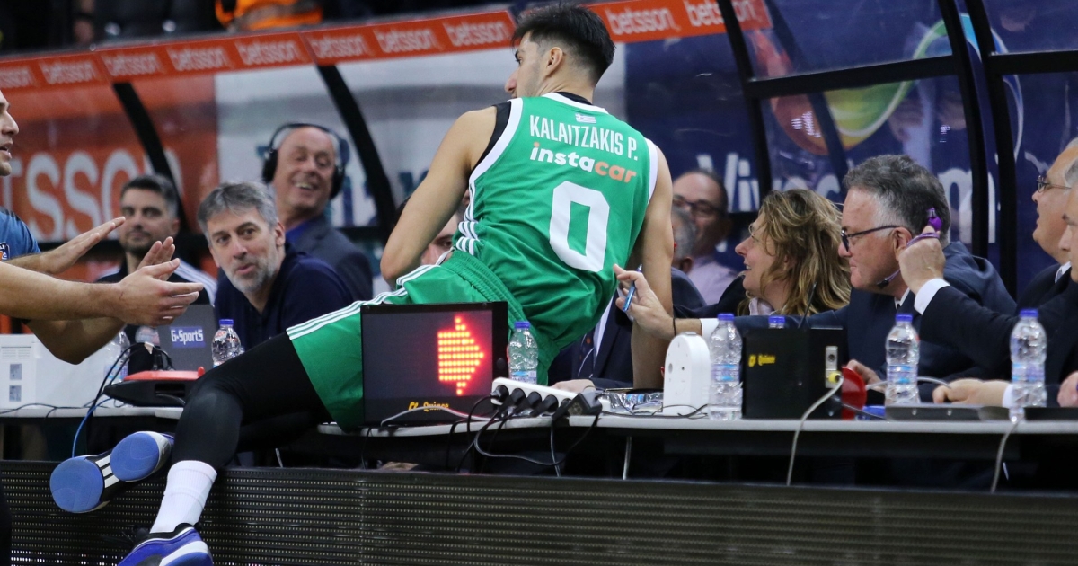 Στα μέσα της τέταρτης περιόδου το σκορ ήταν στο +28 για τους «πράσινους», όμως αυτό δεν απέτρεψε τον Παναγιώτη Καλαϊτζάκη από το να βγάλει μια άμυνα με «αυτοθυσία» η οποία τον... προσγείωσε στο τραπέζι της γραμματείας.