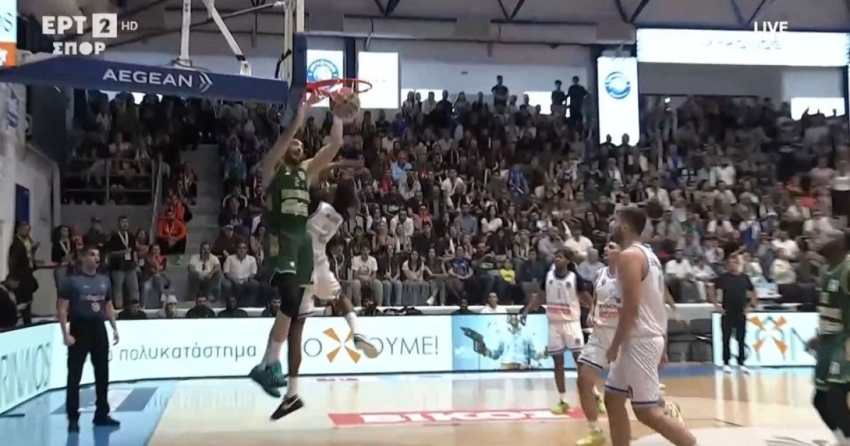 Κατά τη διάρκεια του πρώτου ημιχρόνου στο ματς της Μυκόνου, ο Γιάννης Κουζέγλου μετέτρεψε σε... ασίστ την πάσα του Τζέριαν Γκραντ για ένα εμφατικό και άκρως εντυπωσιακό ally oop κάρφωμα.