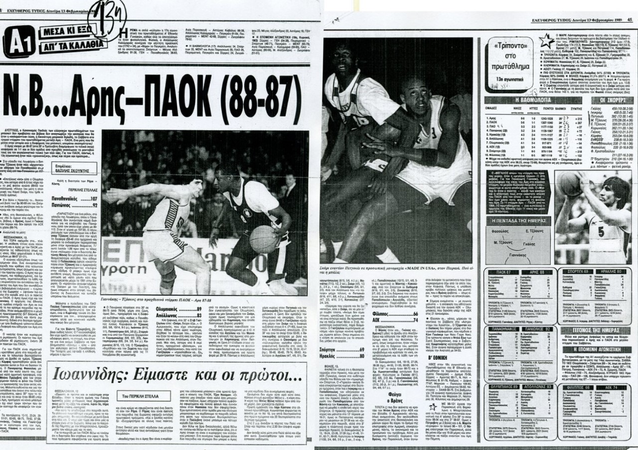 Την μεθεπόμενη ημέρα στον «Ελεύθερο Τύπο» έγραψα ότι τα τελευταία πέντε χρόνια ο Αρης έμοιαζε με τον Τεόφιλο Στίβενσον στα ντουζένια του: πέντε διότι ο ΠΑΟΚ είχε νικήσει τον Αρη για τελευταία φορά σε αγώνα πρωταθλήματος με σκορ 69-62 στις 6 Νοεμβρίου του 1983 (με προπονητή τον Χάρι Πάπας, σωστό τρελοκομείο) και έκτοτε υπέστη δέκα απανωτές ήττες, αλλά όπως παντού, έχει ο καιρός γυρίσματα...
