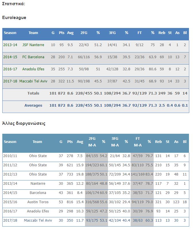 Την σεζόν που ολοκληρώθηκε, ο 26χρονος παίκτης φόρεσε την φανέλα της Μακάμπι, με την οποία είχε κατά μέσο όρο 11.5 πόντους, 3.3 ριμπάουντ και 1.2 ασίστ στην Euroleague.