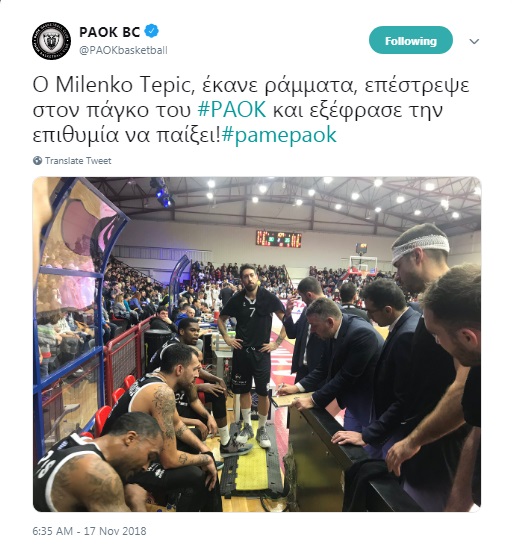 Η ΚΑΕ ΠΑΟΚ ανέβασε τον λογαριασμό της στο twitter φωτογραφία από το μπανταρισμένο κεφάλι του Μιλένκο Τέπιτς.