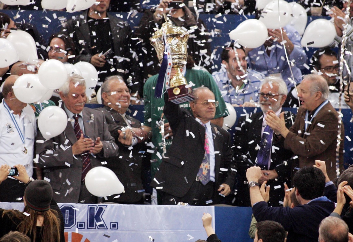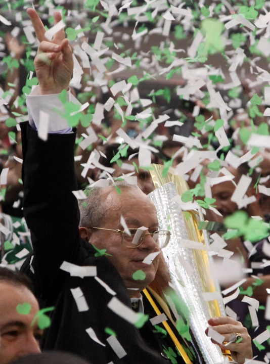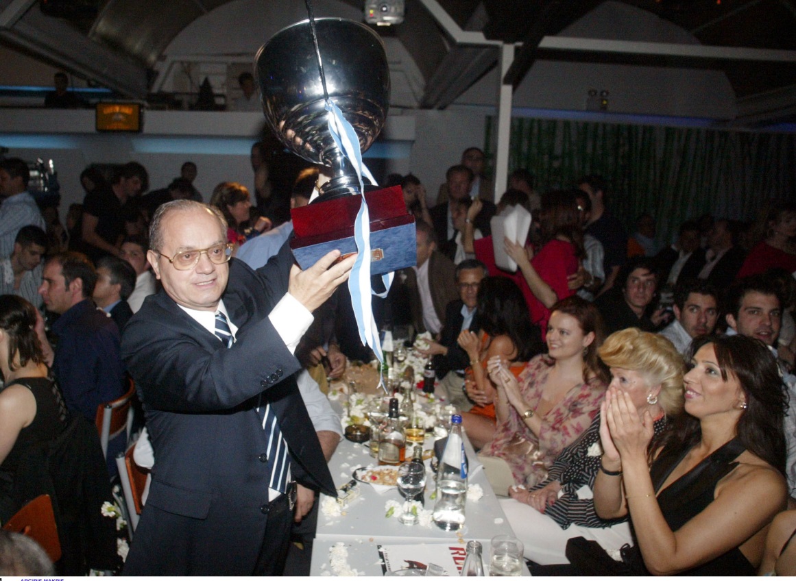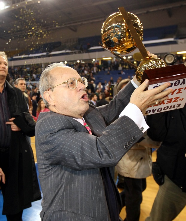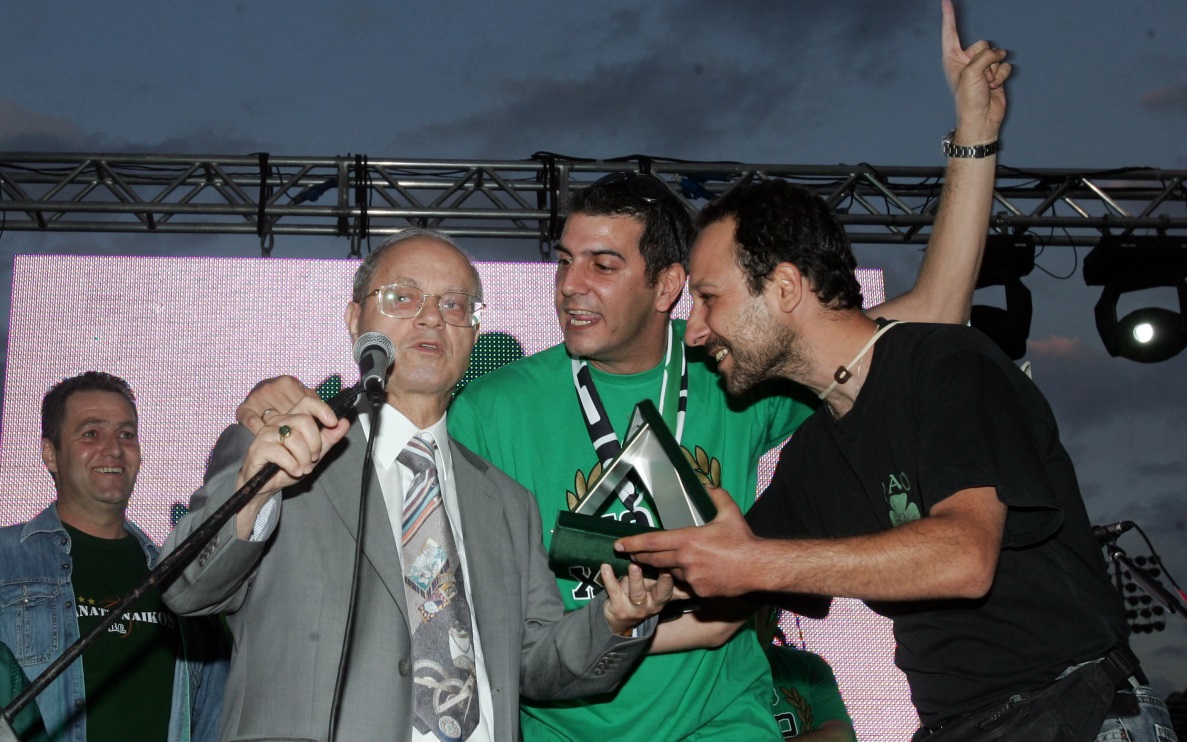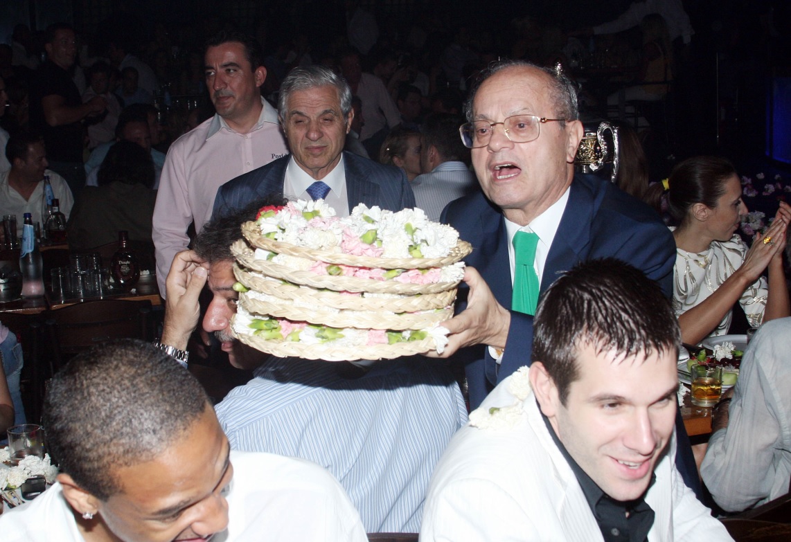2/5/2010: Ο Θανάσης Γιαννακόπουλος στη φιέστα για την κατάκτηση του ποδοσφαιρικού νταμπλ, πανηγυρίζει για την αντίστοιχη επιτυχία της γυναικείας ομάδας βόλεϊ.