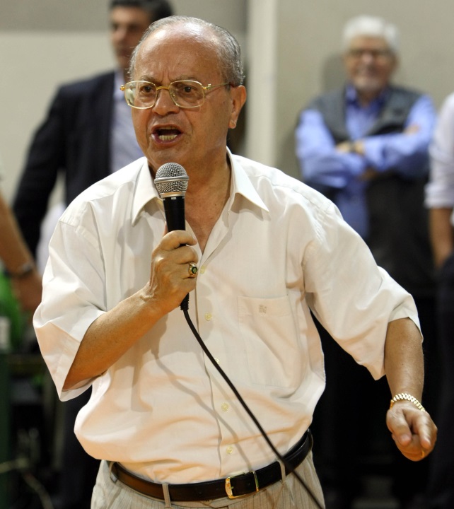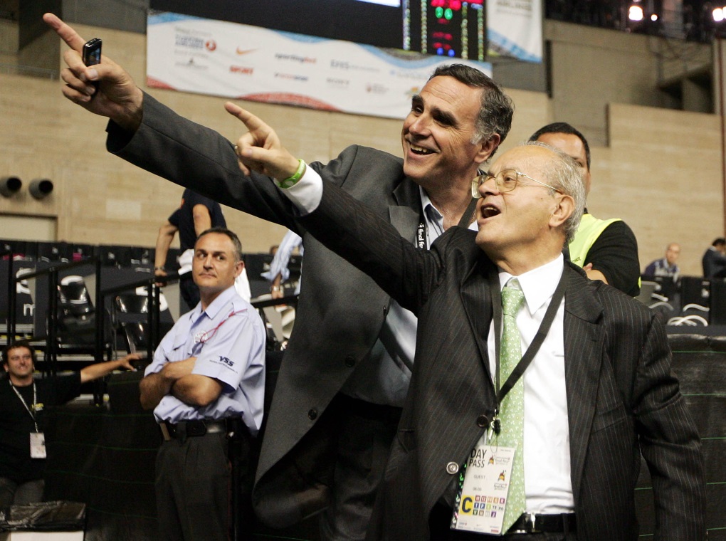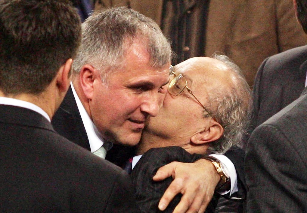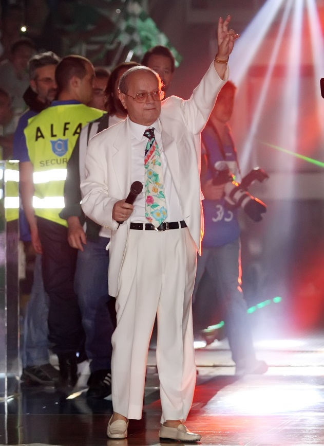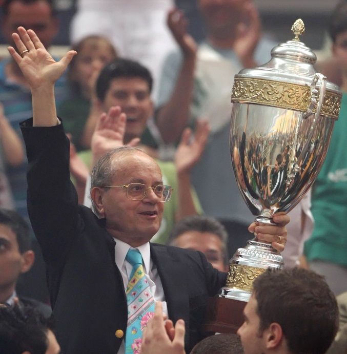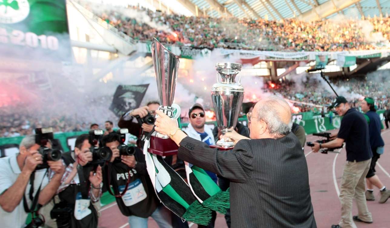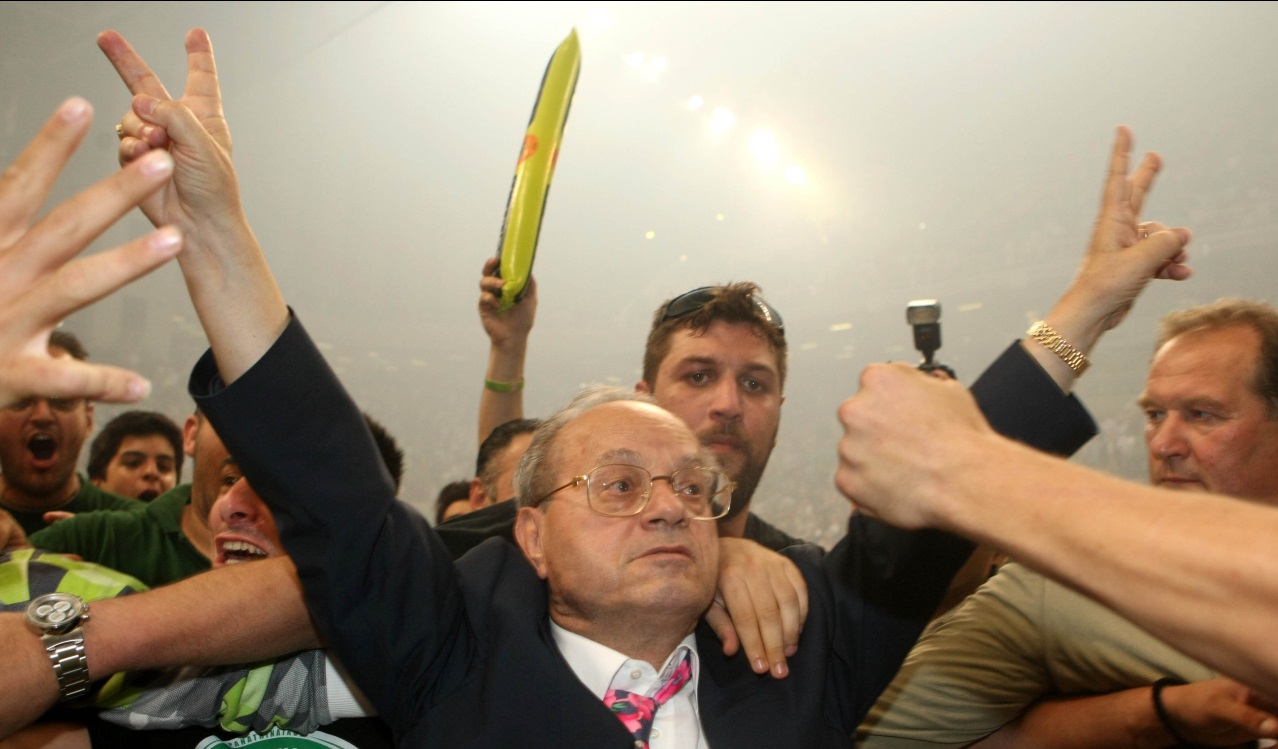2/5/2010: Ο Θανάσης Γιαννακόπουλος στη φιέστα για την κατάκτηση του ποδοσφαιρικού νταμπλ, πανηγυρίζει για την αντίστοιχη επιτυχία της γυναικείας ομάδας βόλεϊ.