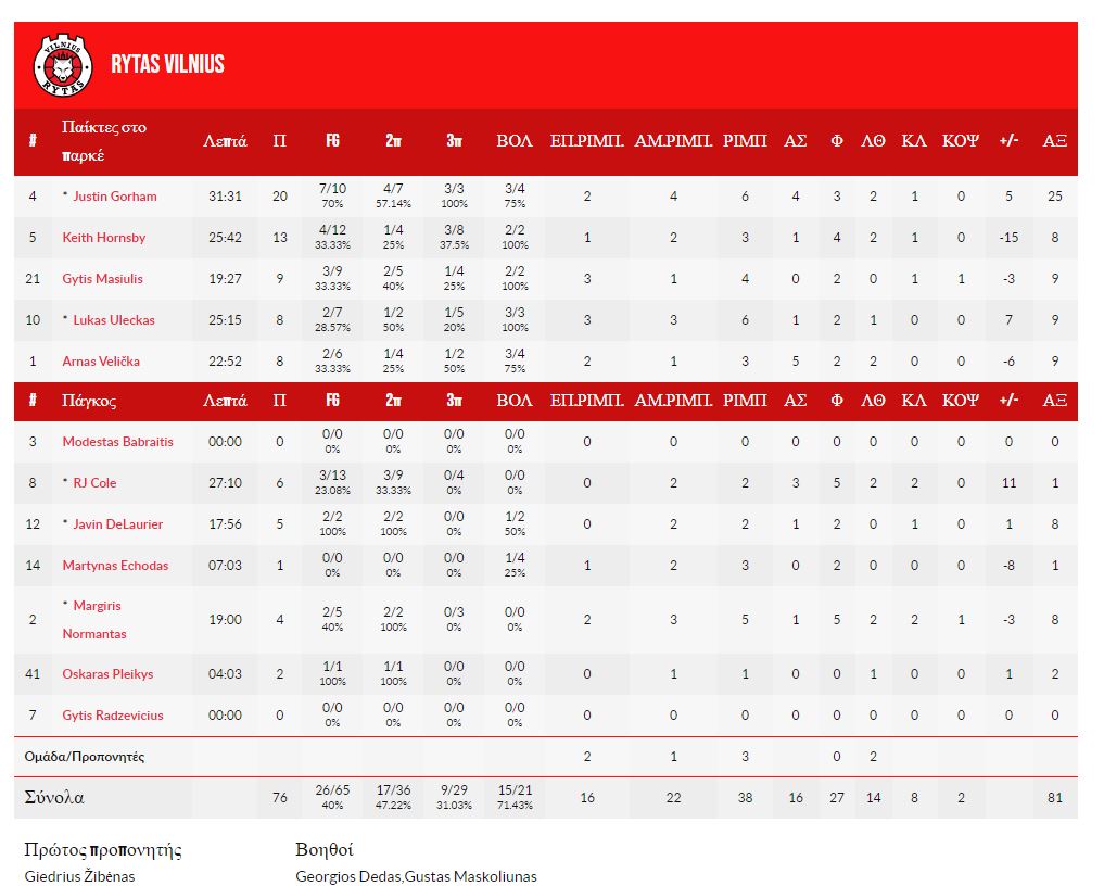 Ο Άντονι Κάουαν ήταν εκείνος που «μίλησε» στα τελευταία δευτερόλεπτα με κρίσιμο γκολ φάουλ και κλέψιμο με αποτέλεσμα να τελειώσει το ματς έχοντας 19 πόντους με 5/10 σουτ και 3 ασίστ. Πολύ καλό ματς και από τους Χρυσικόπουλος (15π., 7ριμπ.), Ετσενίκε (14π., 6ριμπ.) και Χάντερ Χέιλ (13π., 6ριμπ.)