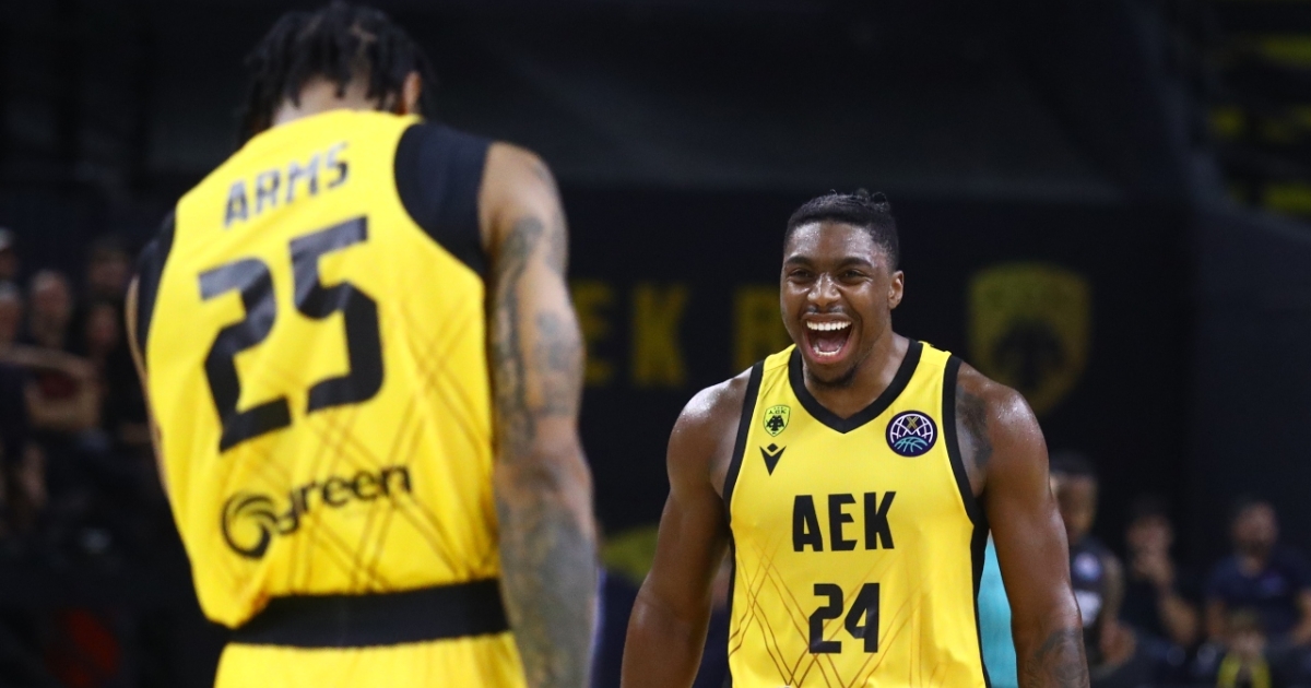 Η ΑΕΚ για δεύτερο σερί ματς βγάζει μια φάση που δείχνει σωστή νοοτροπία. Ο σέντερ της, ο Σίλβα βουτάει για να διεκδικήσει τη μπάλα και αναγκάζει τον αντίπαλο του σε λάθος. Ο Μπάρτλεϊ πασάρει στον Αρμς και εκείνος απογειώνεται ξεσηκώνοντας τον κόσμο στη SUNEL Arena.