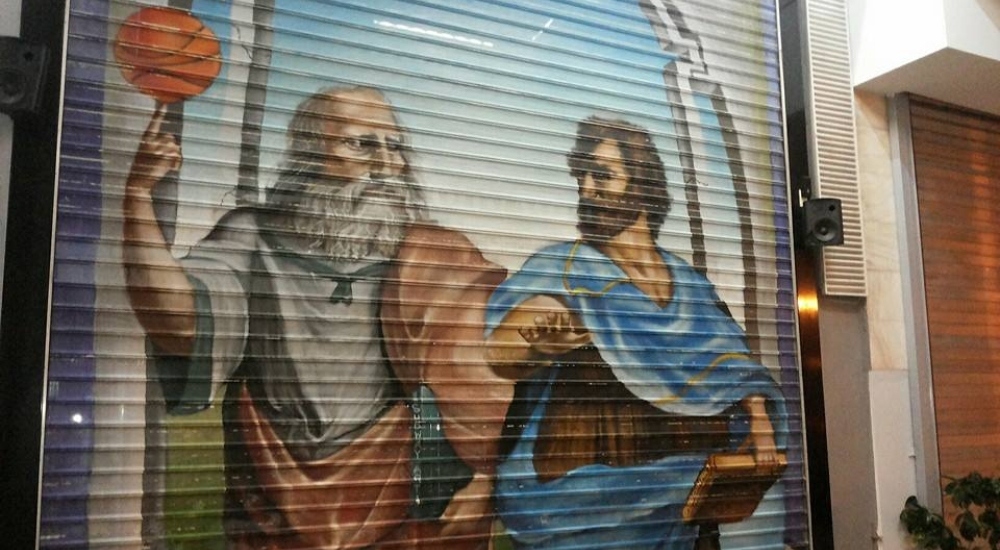 Η Σχολή των Αθηνών είναι μια από τις διασημότερες νωπογραφίες του Ραφαήλ, ενός εκ των κορυφαίων καλλιτεχνών της Αναγεννησιακής τέχνης, έχοντας τον Πλάτωνα και τον Αριστοτέλη στο κέντρο. Ο μεν Πλάτων στα αριστερά δείχνει με προς τον ουρανό ενώ ο Αριστοτέλης διαφωνεί, δείχνοντας προς τη γη με το δεξί χέρι. Το μπασκετικό στοιχείο έχει να κάνει ακριβώς με το ότι στο χέρι του Πλάτωνα μπήκε η μπάλα του μπάσκετ. Παραφράζοντας το γνωστό σύνθημα, «Τι την έκανε την μπάλα ο σοφός»;