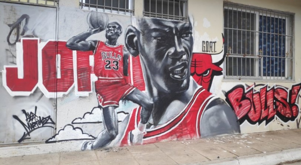 Στα ανοιχτά γήπεδα μπάσκετ της Λεωφόρου Δεκελείας, στο ύψος του παλιού Κένταυρου στη Νέα Φιλαδέλφεια, ο Μάικλ Τζόρνταν έχει τους τελευταίους μήνες τον νέο τόπο... λατρείας του. Ο κορυφαίος μπασκετμπολίστας ever, ο Greatest Of All Time ενέπνευσε τον δημιουργό της εκπληκτικής δημιουργίας που κοσμεί το κτίριο πλάι στο μικρότερο από τα δυο γήπεδα. Παρεμπιπτόντως, στο ίδιο σημείο υπήρχε παλαιότερο graffiti του Air, το οποίο… αναβαθμίστηκε και το αποτέλεσμα είναι ΕΝΤΥΠΩΣΙΑΚΟ.