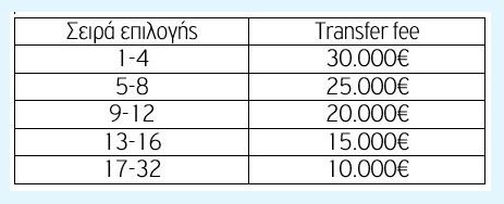 (α) Oι ομάδες που θα επιλέξουν αθλητές στα draft θα έχουν την υποχρέωση να πληρώνουν transfer fee στα σωματεία/ακαδημίες που ανήκουν οι αθλητές, σύμφωνα με τα παρακάτω: