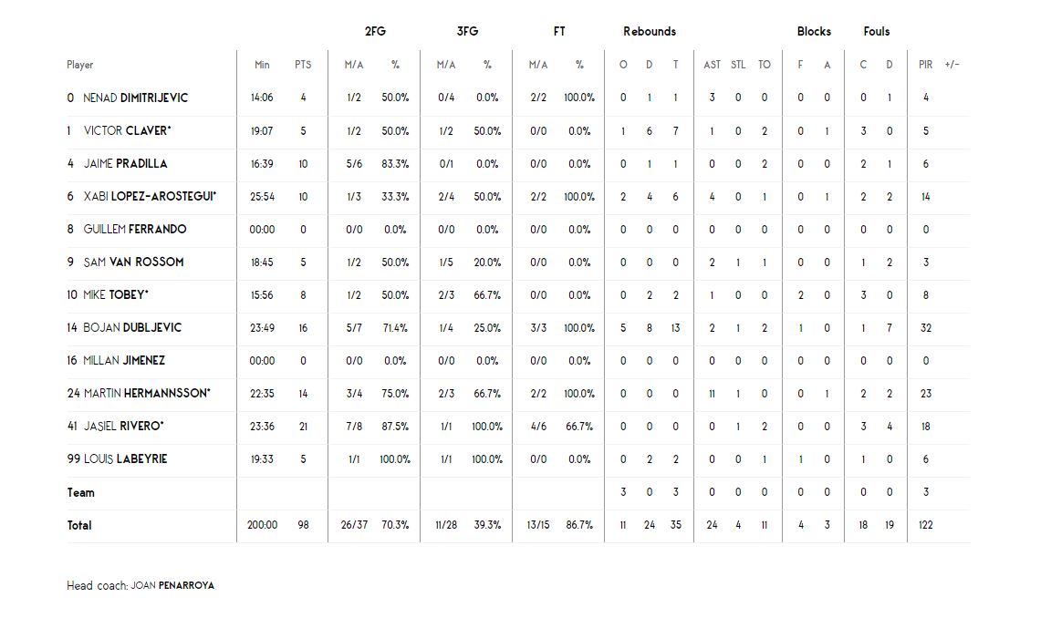 Ο Χασιέλ Ριβέρο ήταν εκείνος που έβαλε φαρδιά-πλατιά την υπογραφή του στο παιχνίδι που χάρισε το εισιτήριο στην ισπανική ομάδα καθώς σε 23 λεπτά συμμετοχής είχε 21 πόντους με 7/8 δίποντα, 1/1 τρίποντο και 4/6 βολές. Ο Μάρτιν Χέρμανσον είχε 14 πόντους και 11 ασίστ σουτάροντας 3/4 δίποντα και 2/3 τρίποντα. «Διψήφιοι» για τη Βαλένθια ήταν επίσης οι Πραντίγια και Λόπεζ-Αροστέγκι.