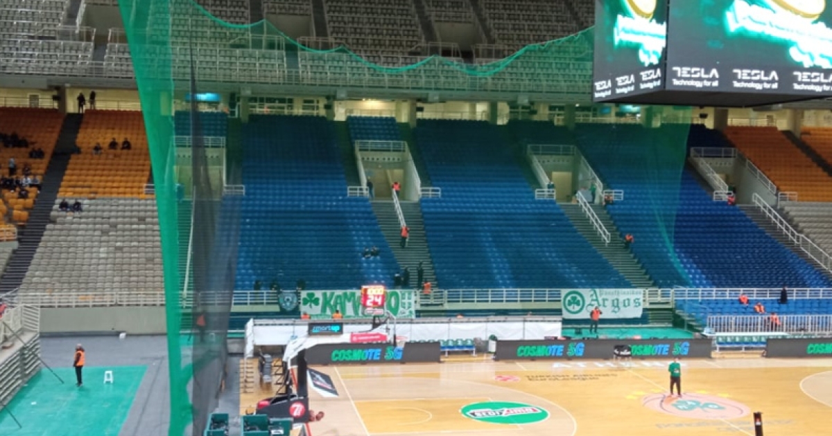 Στο μισό κομμάτι του παρκέ έχει τοποθετηθεί δίχτυ ασφαλείας, το οποίο πιάνει όχι μόνο το χώρο πίσω από τον πάγκο που θα καθίσει ο Ολυμπιακός, αλλά καλύπτει και τον χώρο πίσω από τη μία μπασκέτα.