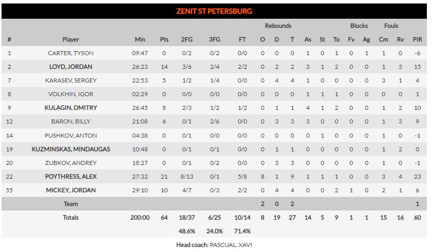 Τέσσερις παίκτες της Ρεάλ ήταν «διψήφιοι» (Γιαμπουσέλε 13π., Γιουλ 13π., Τόμπκινς 12π., Πουαριέ 10π.) ενώ για τη Ζενίτ δεν έφτασαν οι 21 πόντοι του Άλεξ Πόιθρες.