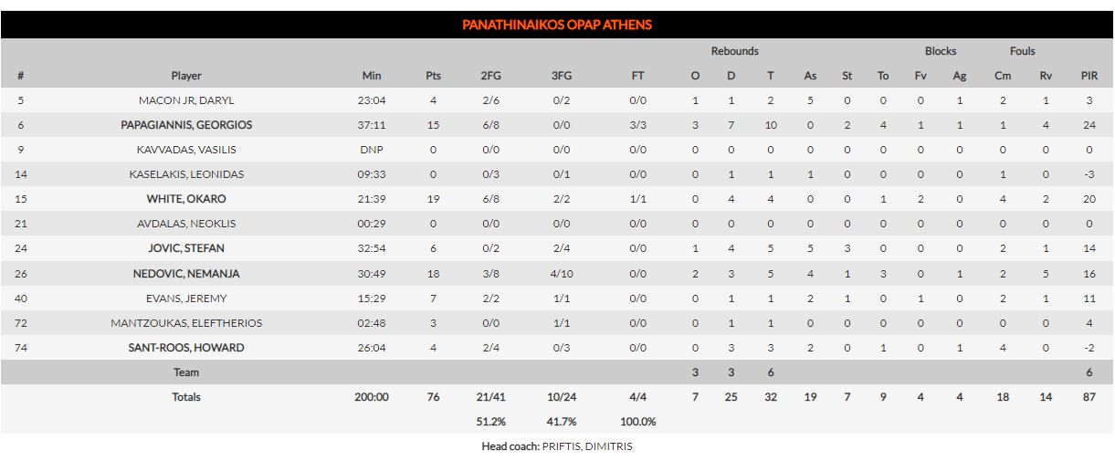 Ο Σέρβος (18π., 3/8τρ., 4/10τρ., 5ριμπ., 4ασ.) ήταν εκείνος που έδωσε το έναυσμα για να ανοίξει η ψαλιδα της διαφοράς, ο Οκάρο Ουάιτ ο παίκτης-κλειδί για τον Παναθηναϊκό με 19 πόντους και εξαιρετικά ποσοστά ευστοχίας (6/8δίπ., 2/2τρ., 1/1β., 4ριμπ.) ενώ ο Γιώργος Παπαγιάννης δήλωσε και πάλι «παρών» με «double double» έχοντας 15 πόντους και 10 ριμπάουντ.