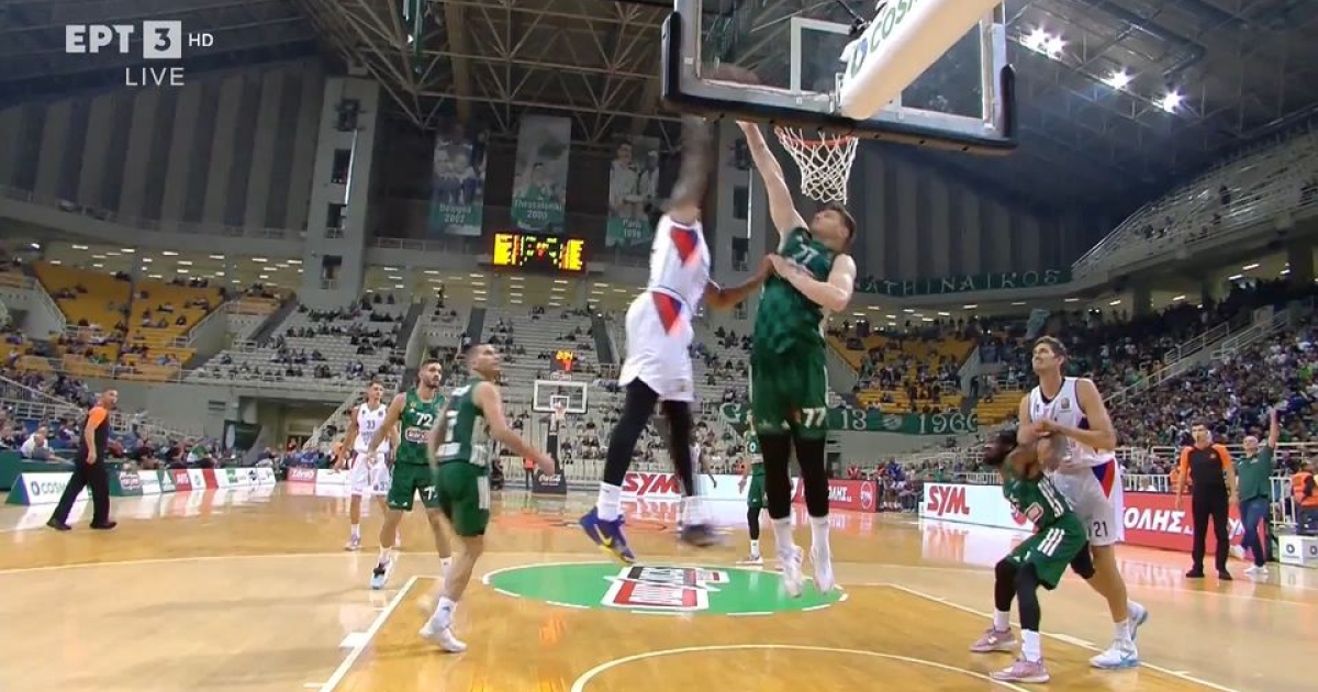 Ένα απίθανο poster κάρφωμα πάνω στην άμυνα του Αρτούρας Γκουντάιτις, με τον Κλάιμπερν να ξεκινάει την προσπάθειά του από την baseline και να φτάνει μέχρι το καλάθι του Παναθηναϊκού.