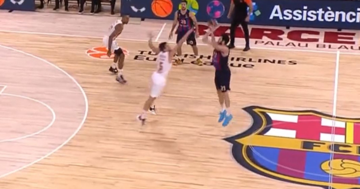 Ο Άλεξ Αμπρίνες ευστόχησε σ' ένα απίθανο τρίποντο κατά τη διάρκεια της τελευταίας περιόδου του αγώνα Μπαρτσελόνα-Ολυμπιακός.