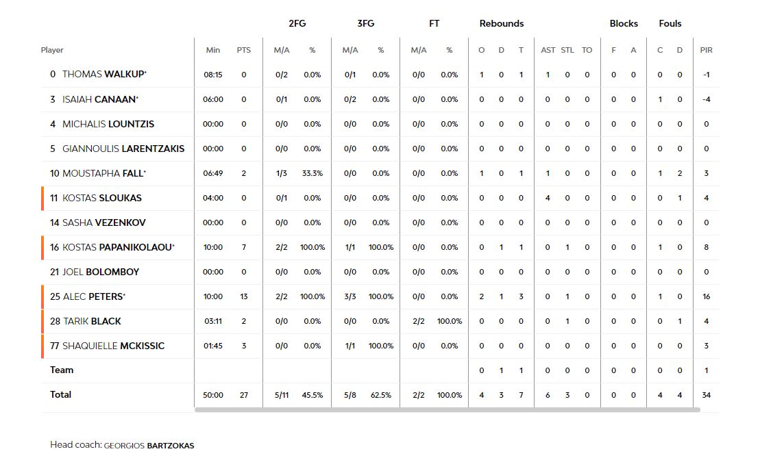 Συγκεκριμένα ηγήθηκε του Ολυμπιακού για το +12 (27-15) του πρώτου δεκαλέπτου έχοντας 13 πόντους με 5/5 εντός παιδιάς! Συγκεκριμένα έκλεισε την πρώτη περίοδο με 2/2 δίποντα και 3/3 τρίποντα, ενώ «έγραψε» στην στατιστική του 3 ριμπάουντ και 1 κλέψιμο, με αποτέλεσμα να μαζέψει από νωρίς 16 βαθμούς στο σύστημα αξιολόγησης.