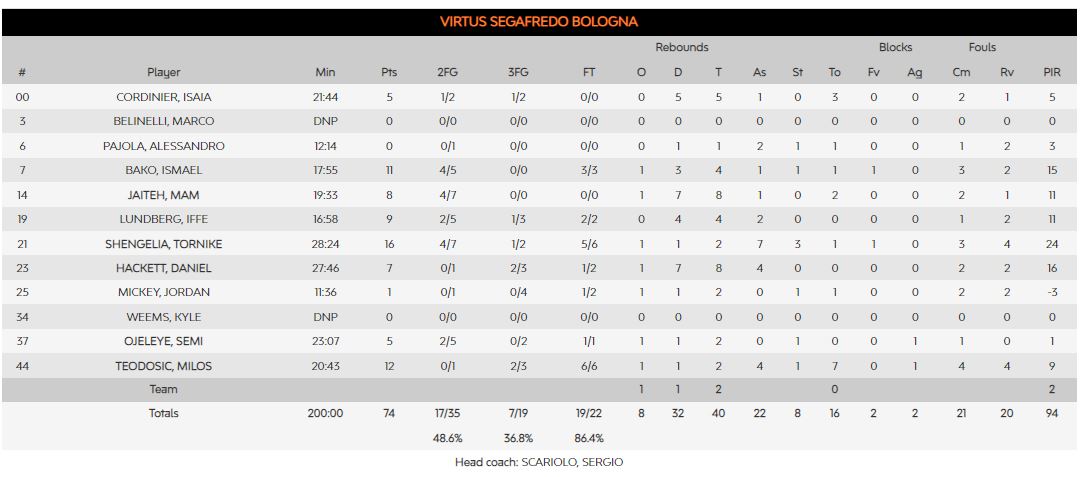 Από την Βίρτους που δεν έδειξε και κάτι το ιδιαίτερο, καλύτερος ήταν ο Σενγκέλια έχοντας 16 πόντους, 2 ριμπάουντ, 7 ασίστ και 3 κλεψίματα.