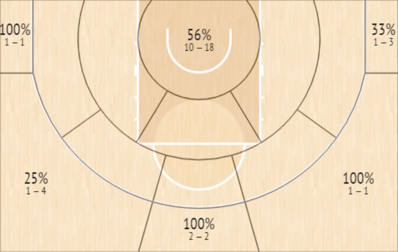 Ένα διάστημα όπου σκοράρει σχεδόν 6 πόντους σε κάθε ματς (σ.σ. 5.9 για την ακρίβεια) και έχοντας 56% στα δίποντα (10/18 στο σύνολο), 55% στα τρίποντα (6/11 συνολικά) και 100% στις βολές (3/3 από τη γραμμή της φιλανθρωπίας). Επιπλέον «κατεβάζει» και 3.4 ριμπάουντ, ενώ έχει +4.6 πόντους στο +/- της στατιστικής του τον τελευταία μήνα. Ένα χαρακτηριστικό του τρόπου με τον οποίο αγωνίζεται αποτυπώνεται στο Shot Chart.