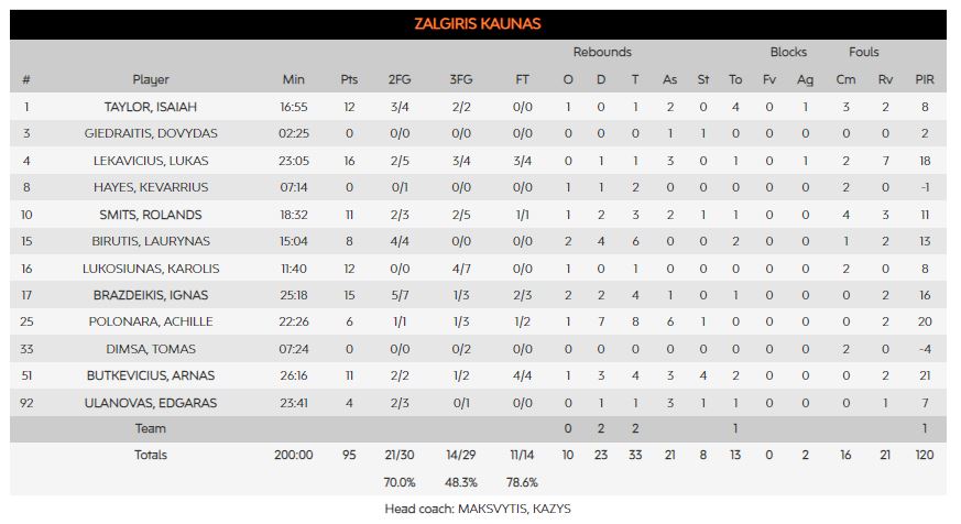 Όπως και έγινε. Οι Λιθουανοί ήταν καταιγιστικοί και παρέμειναν «ζωντανοί» στη διεκδίκηση των φετινών play-offs φτάνοντας στο 17-15 ρεκόρ. Άλλωστε τα στατιστικά «μίλησαν» από μόνα τους. Η Ζάλγκιρις είχε 21/30 δίποντα και 14/29 τρίποντα όπως επίσης και πέντε παίκτες «διψήφιους».